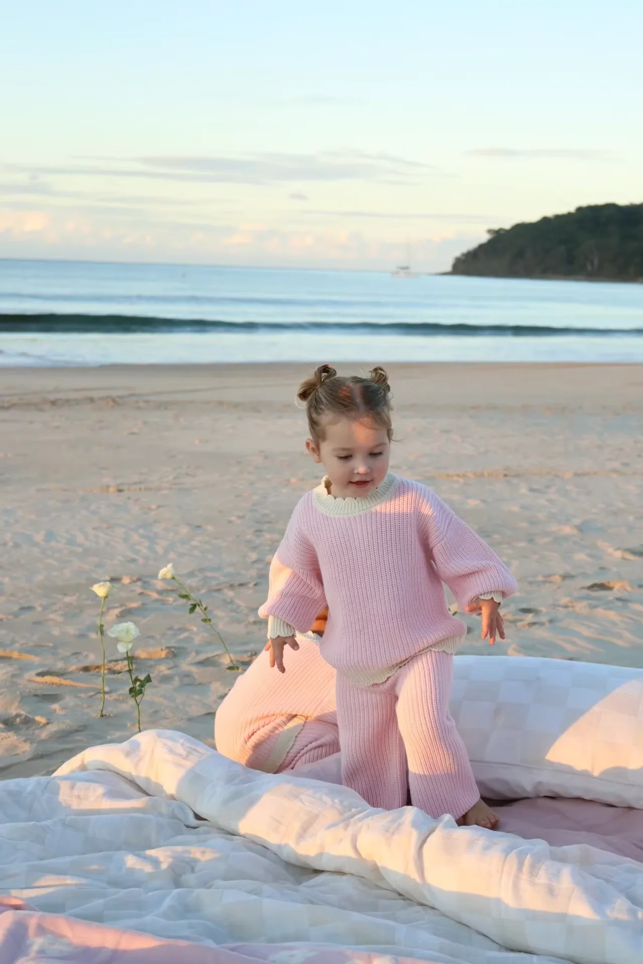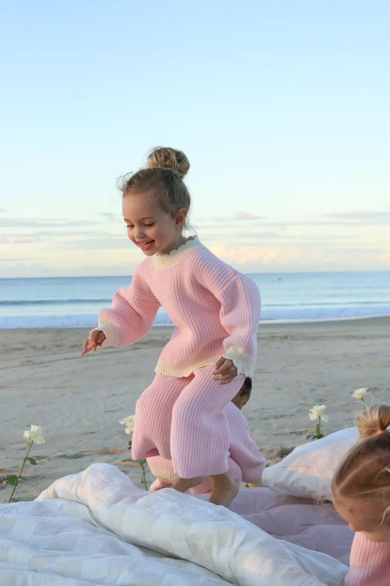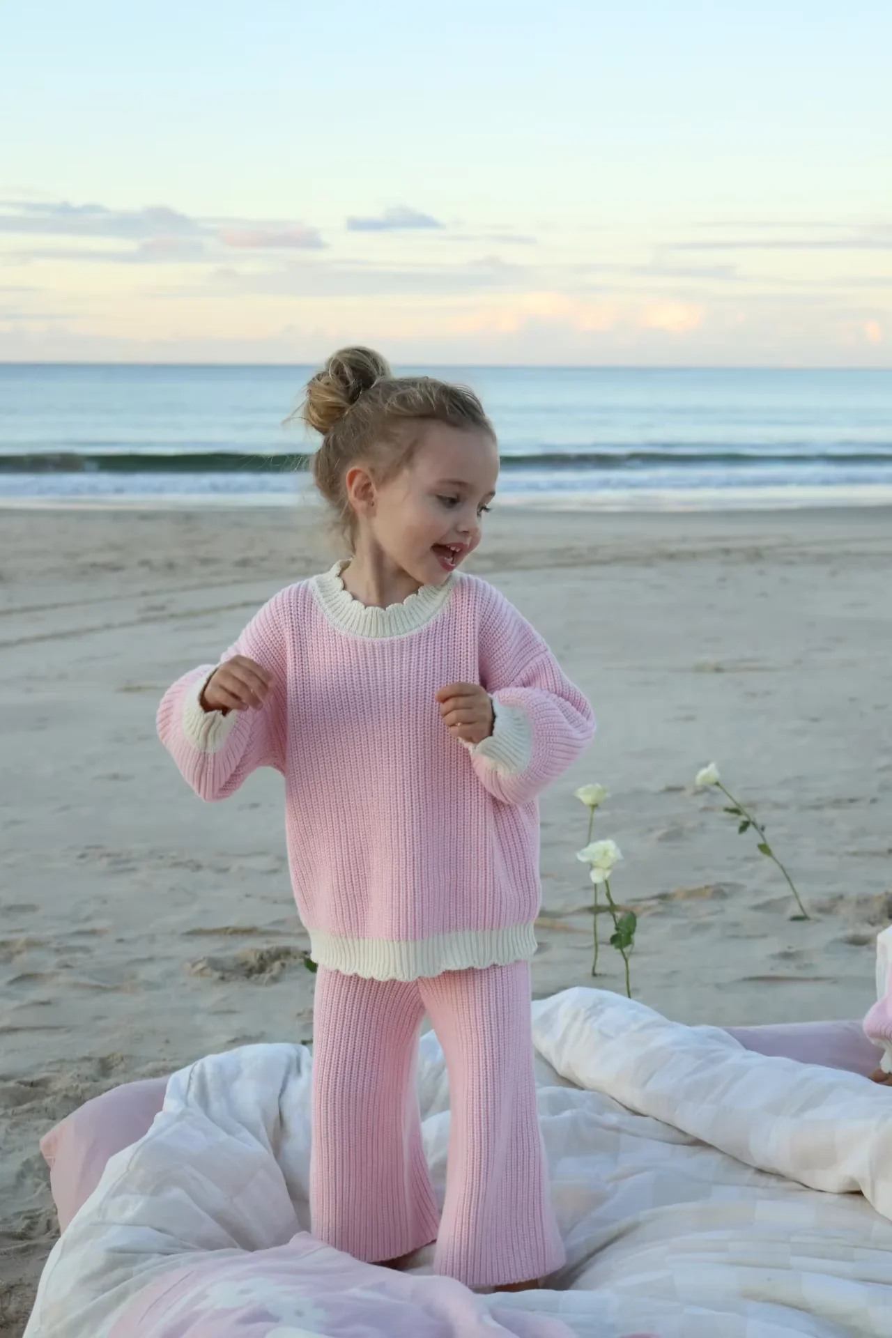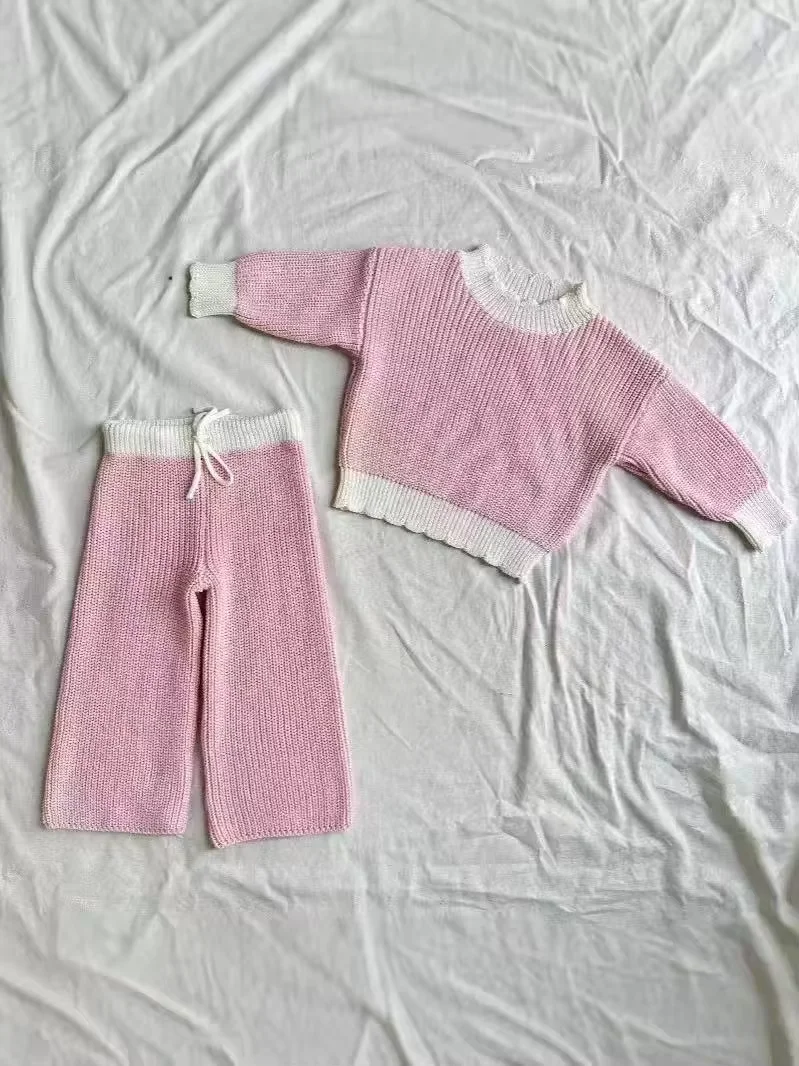 Adorable Custom 100% Cotton Baby Sweater Floral Collar Hem Set Winter Long Sleeve Chunky Pullover Kids Knit Set