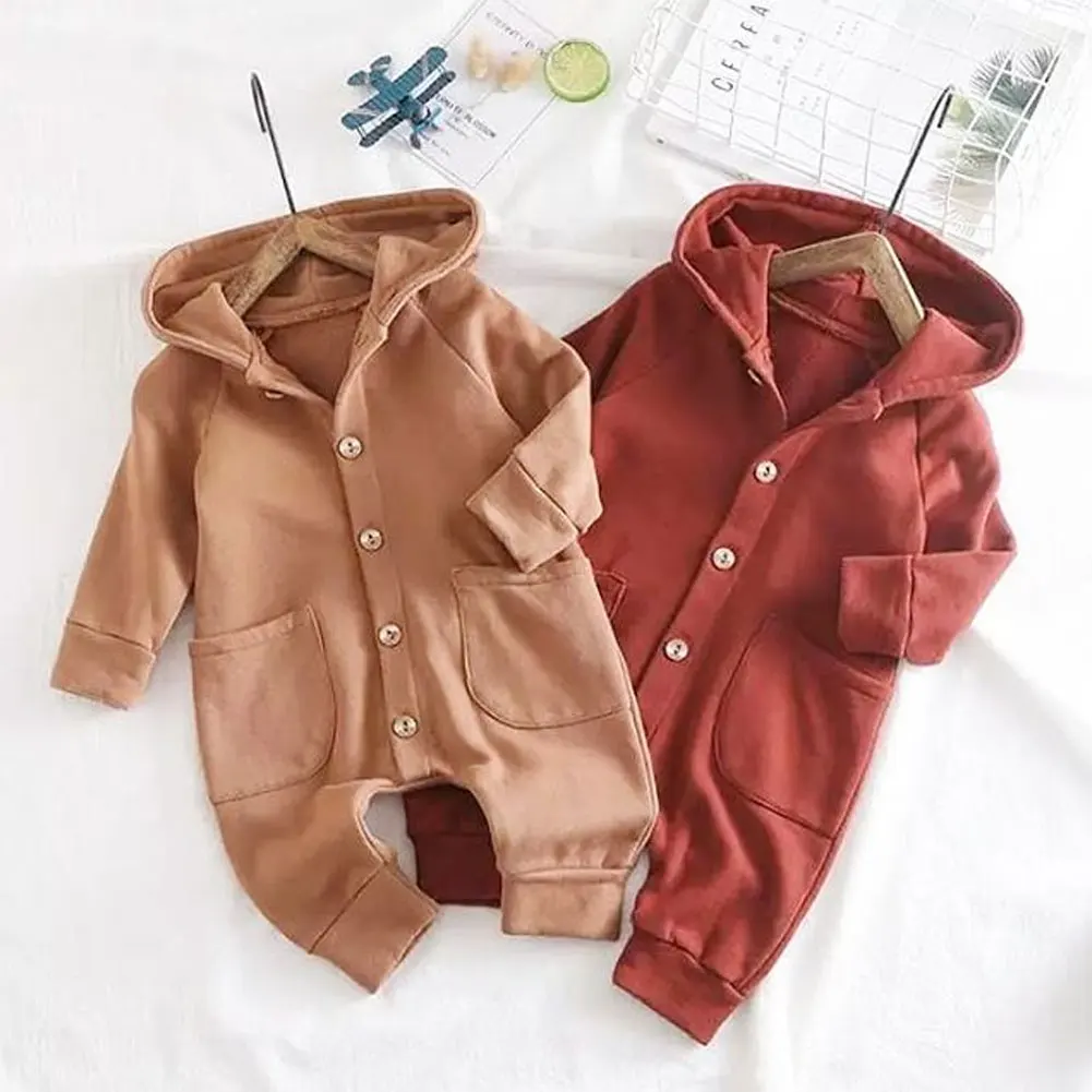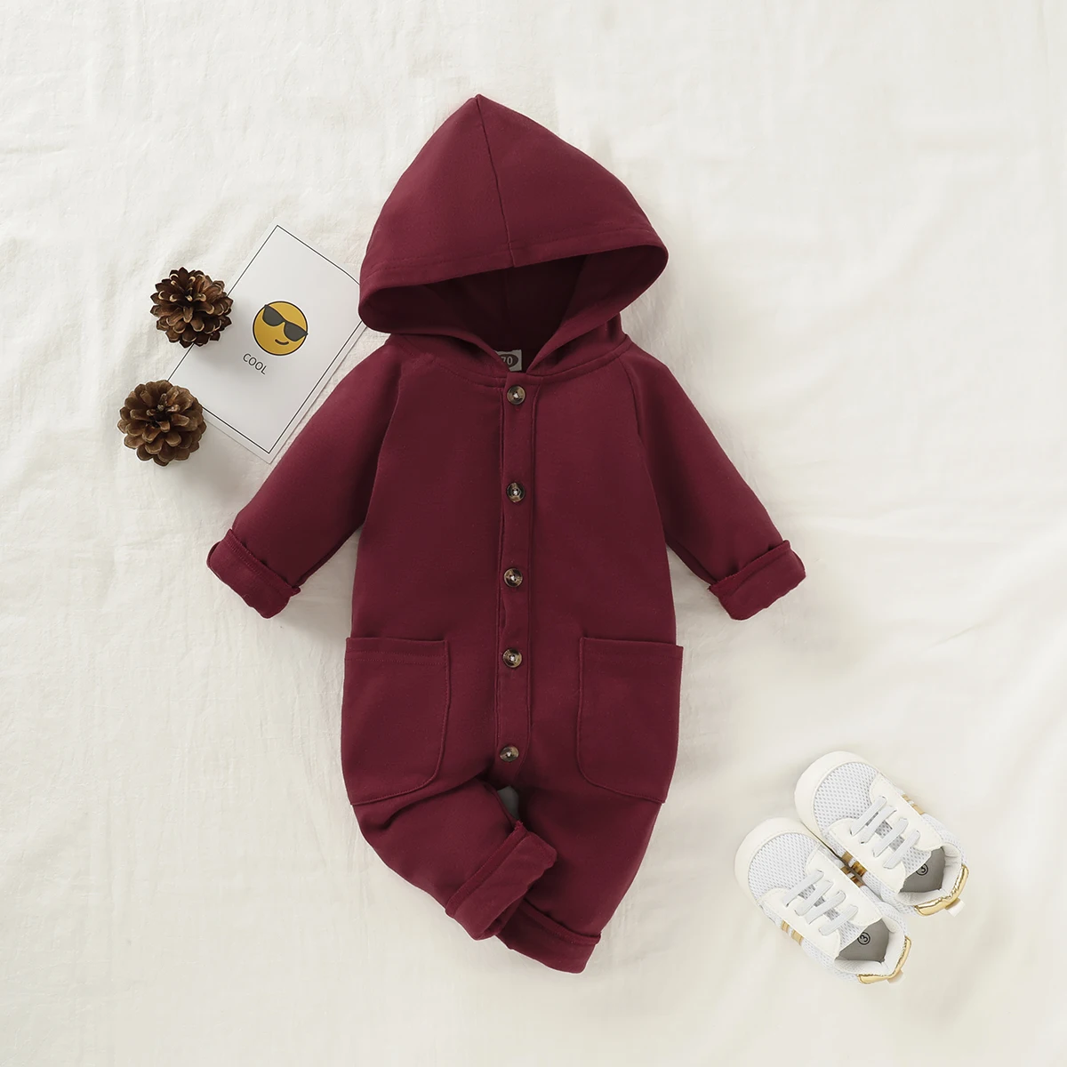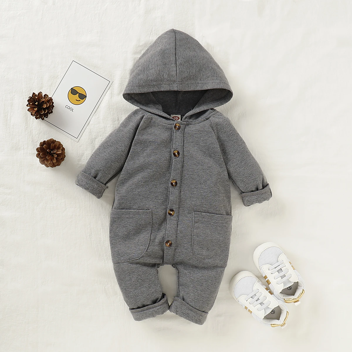Baby Spring Autumn Clothing Newborn Infant Baby Boy Girls Kid Solid Long Sleeve Hooded Button Pockets Romper Winter Warm