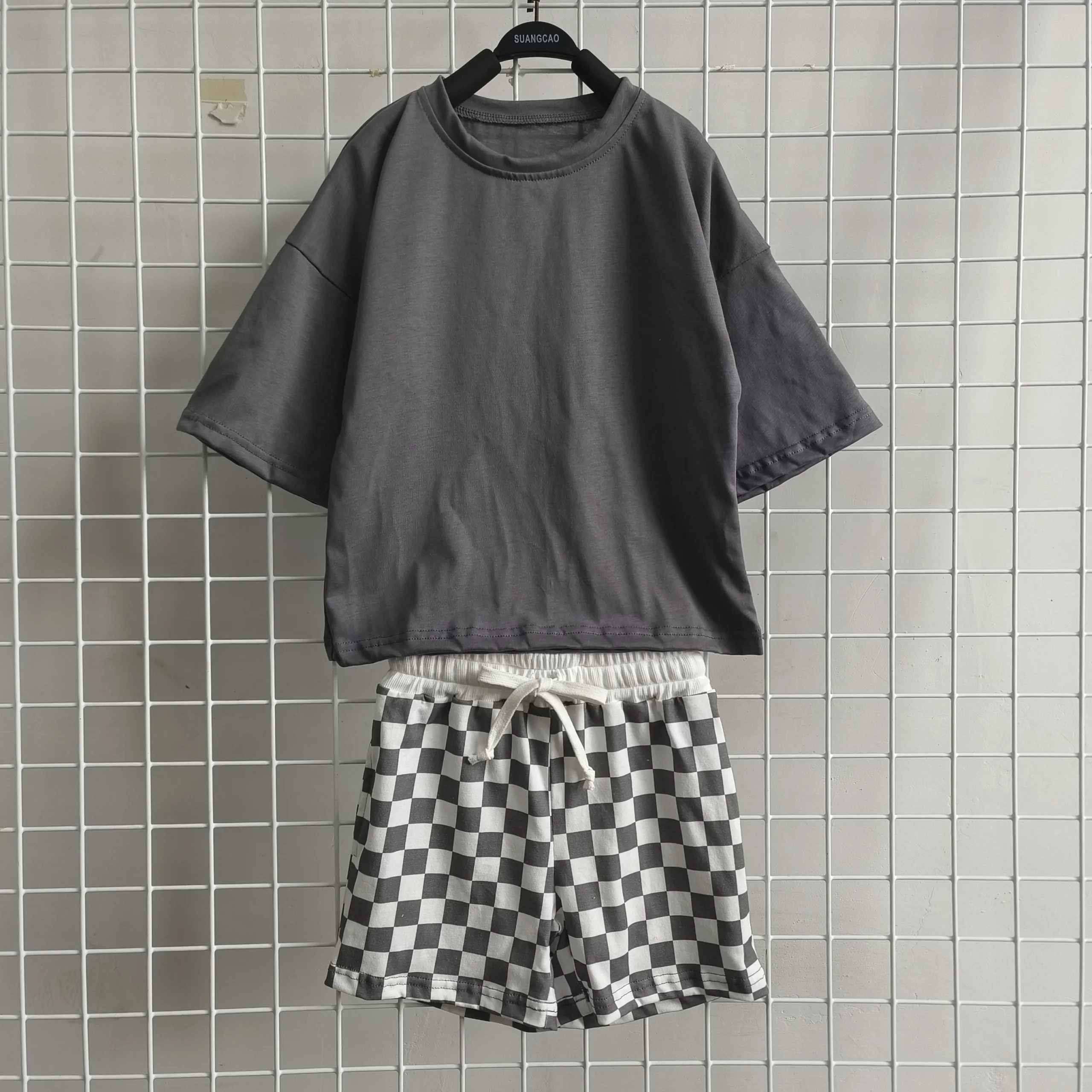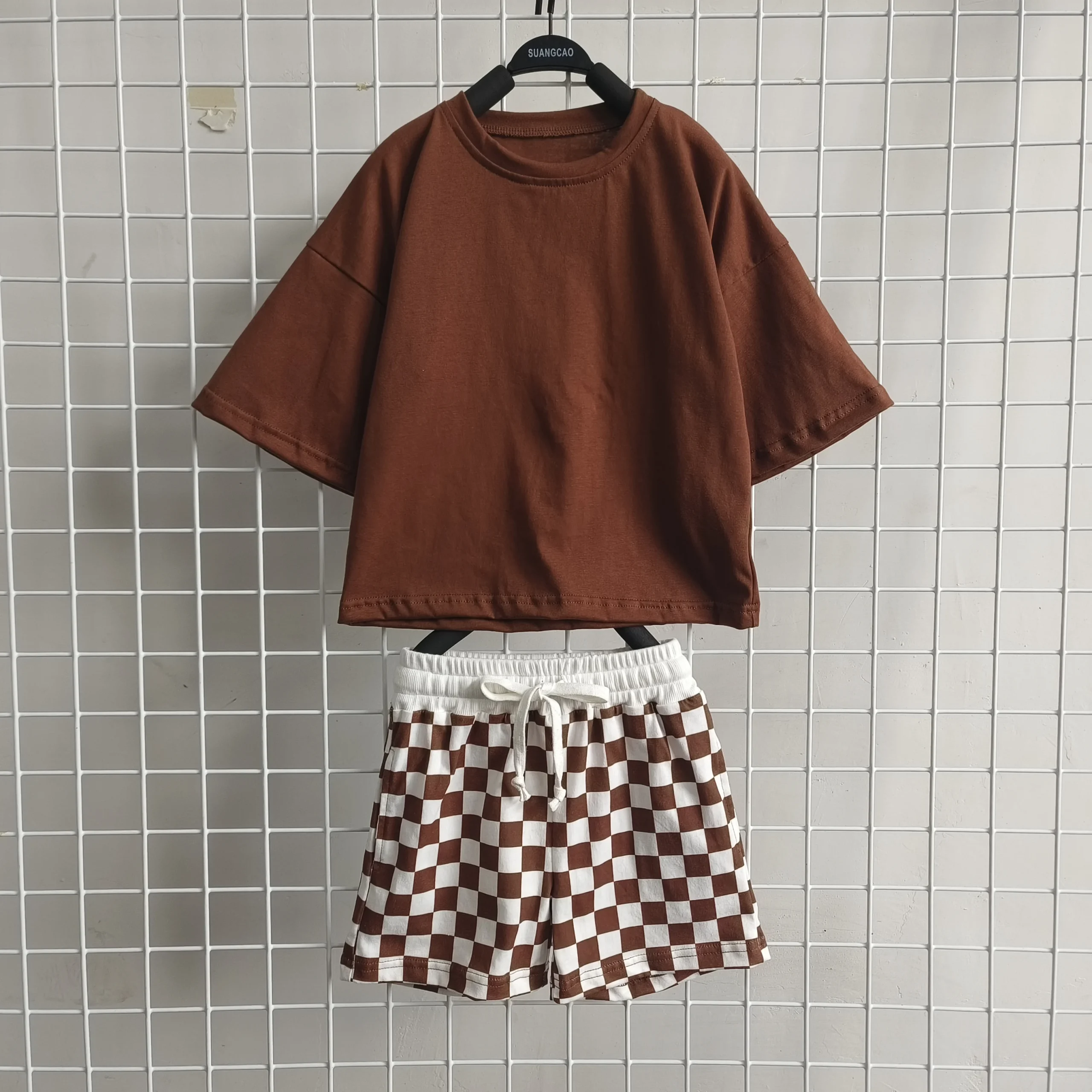 Custom Kids Toddlers Cotton Soft Summer 2pcs Casual Set Solid Color Shirt and Checkboard Shorts Baby Outfits