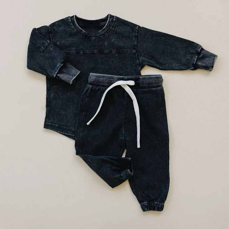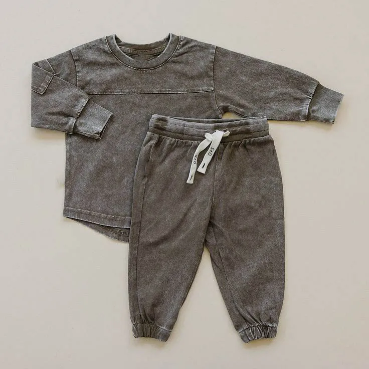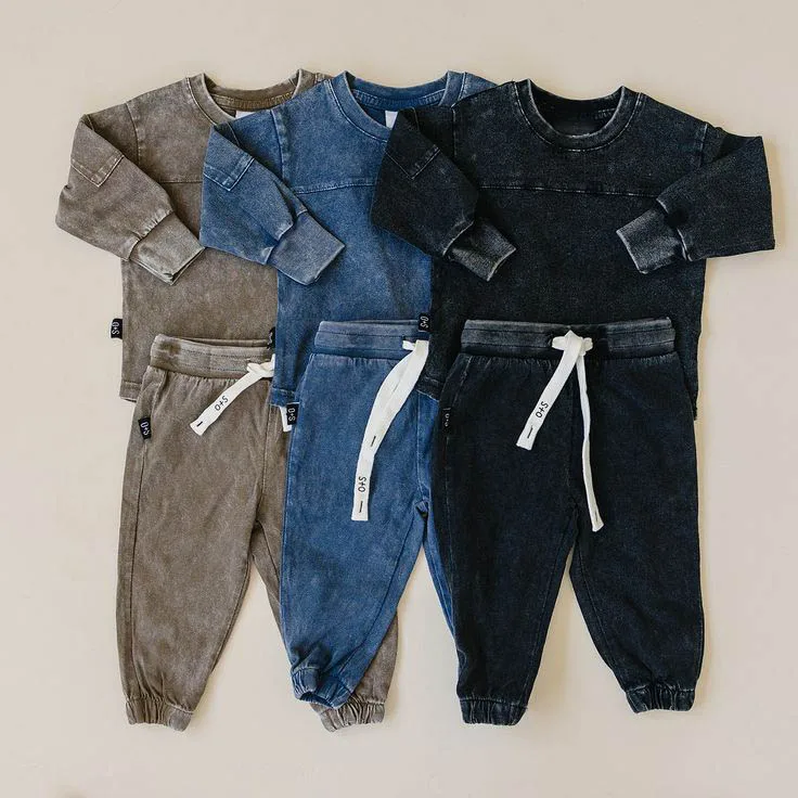 Custom Knitted Full Sleeve Baby Clothes Set Acid Wash Spring Autumn Wholesale Casual Style Cotton Fabric Solid Pattern