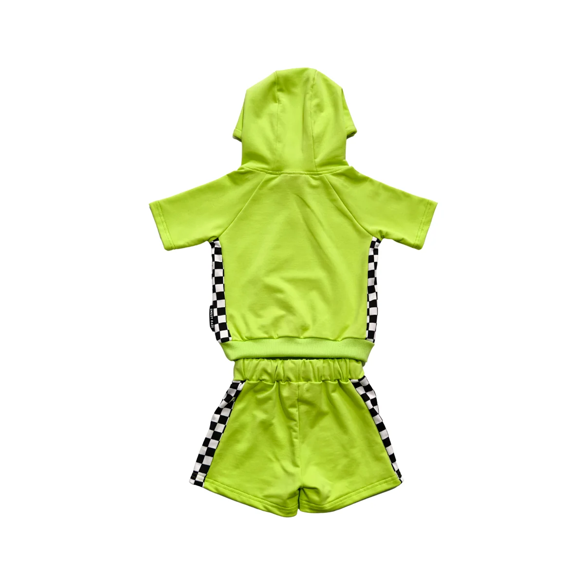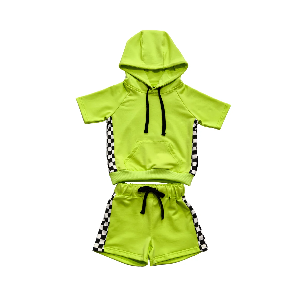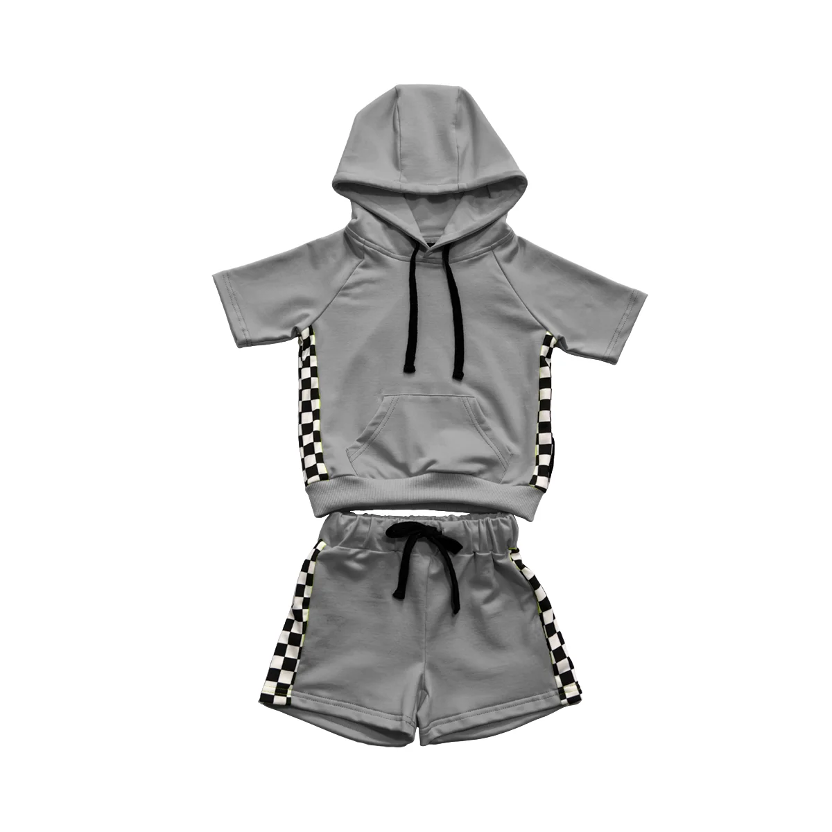 Custom-made Hooded Kids Set with Printed Drawstring Shorts and Short Sleeves a Two-piece Set