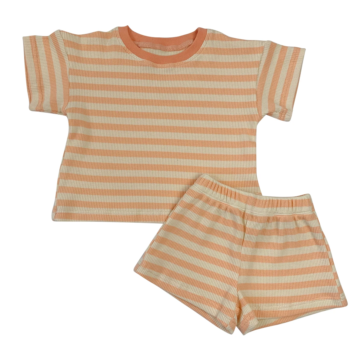 Custom Summer Baby Kids Boys Girls Unisex Stripe Waffle Cotton Cute Shorts Sleeve and Shorts Set Outfit