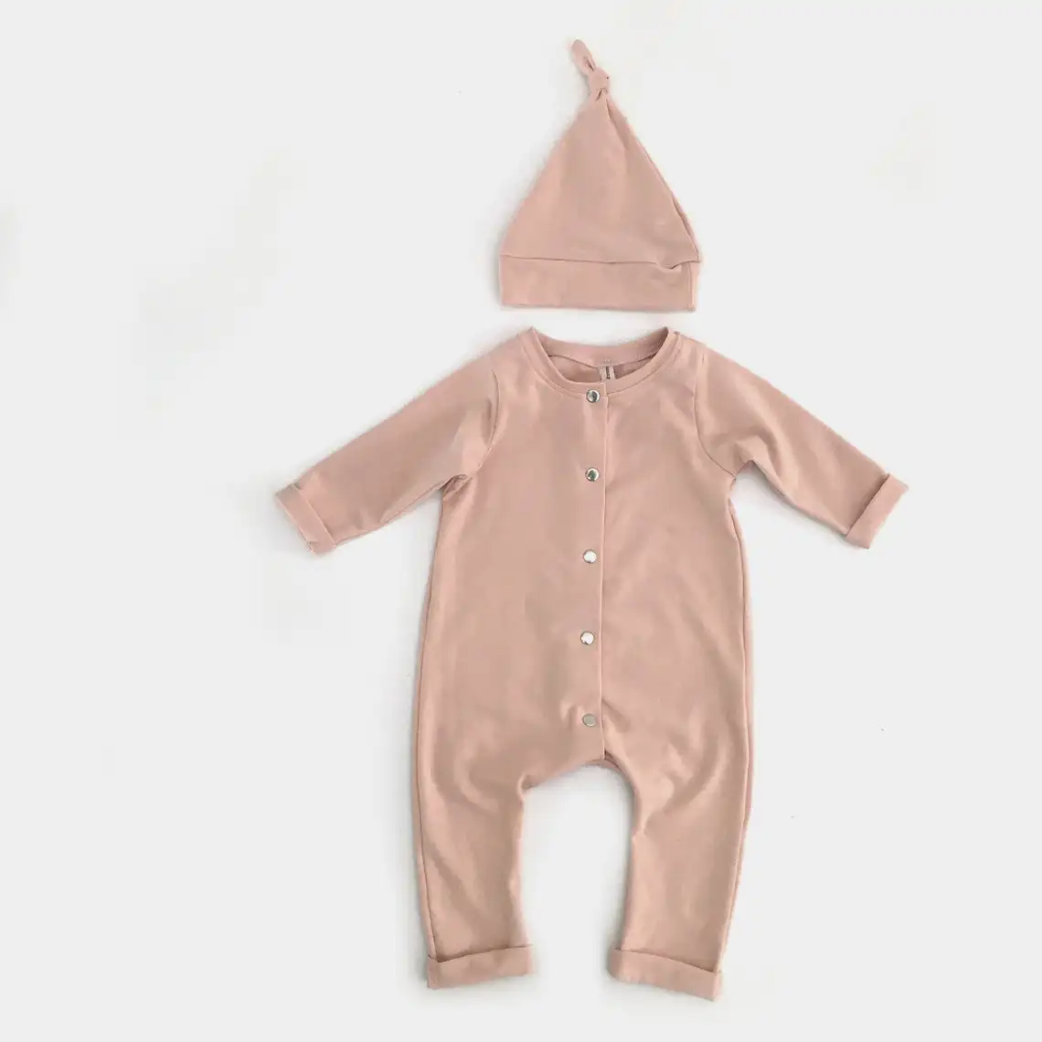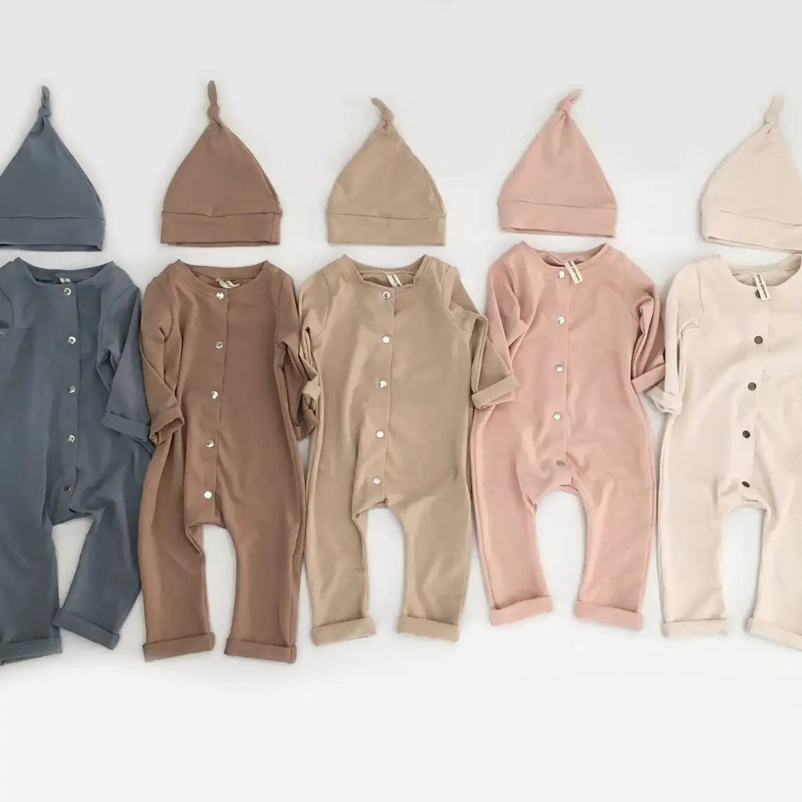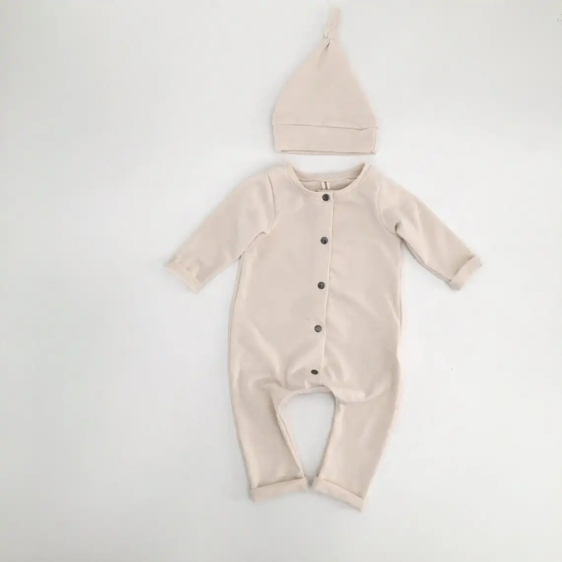 Hot Sell Costom Newborn Neutral Baby Cotton Long Sleeve Button up Baby Romper with Hat Jumpsuit