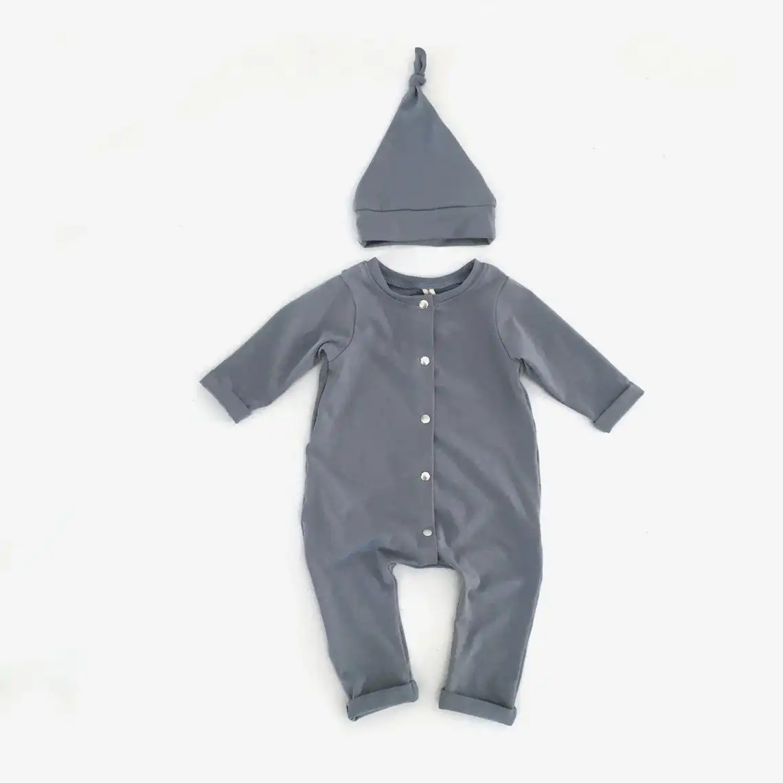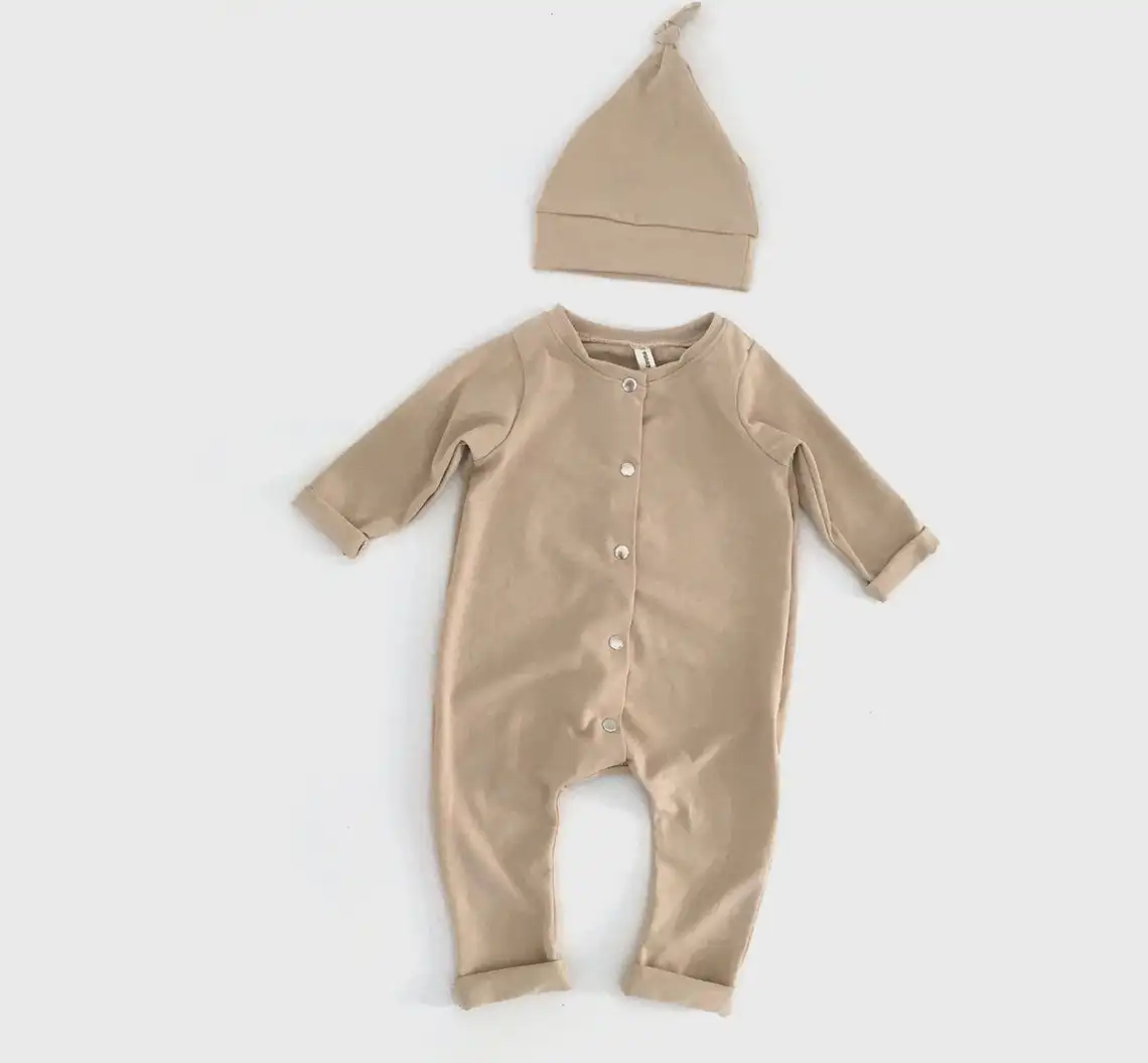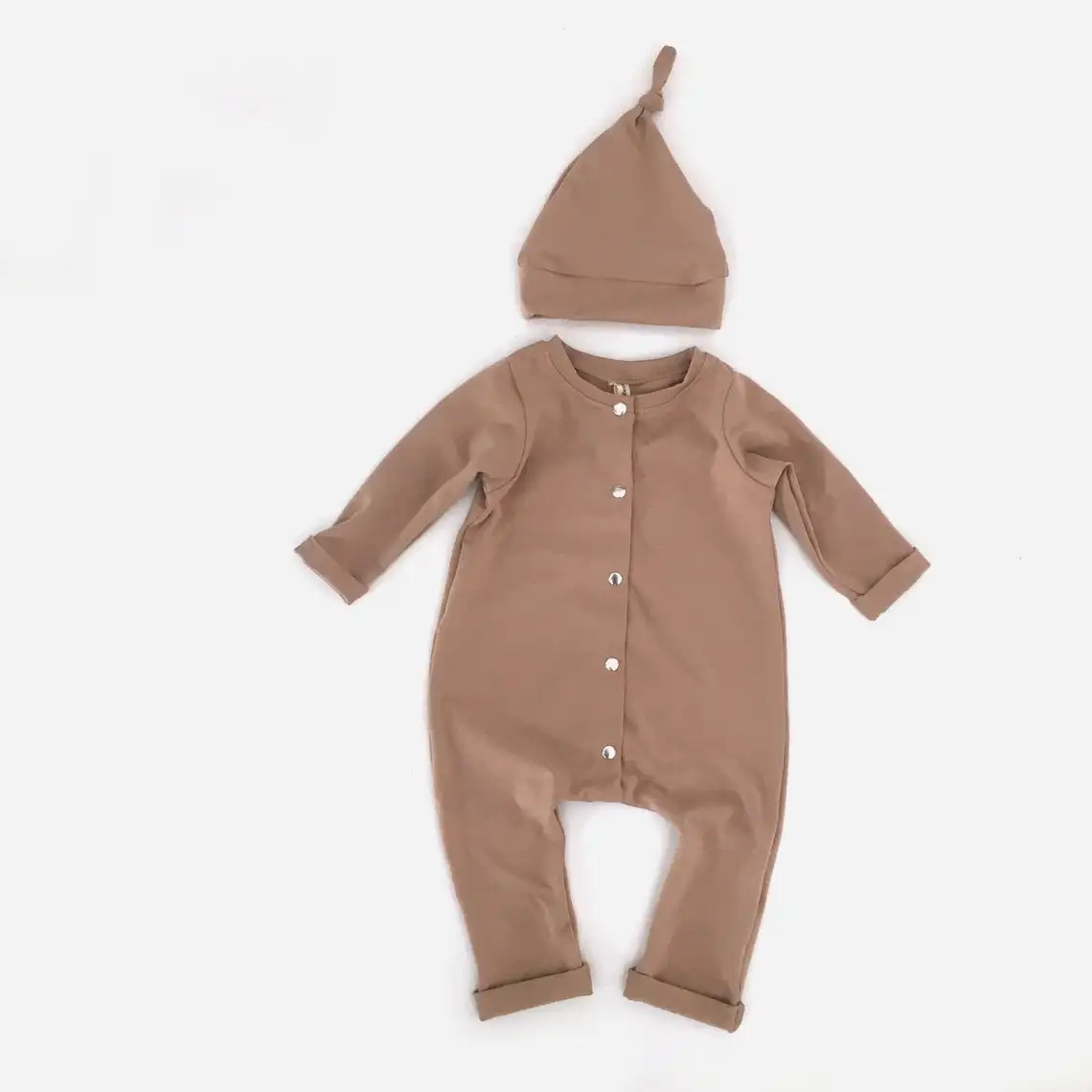 Hot Sell Costom Newborn Neutral Baby Cotton Long Sleeve Button up Baby Romper with Hat Jumpsuit