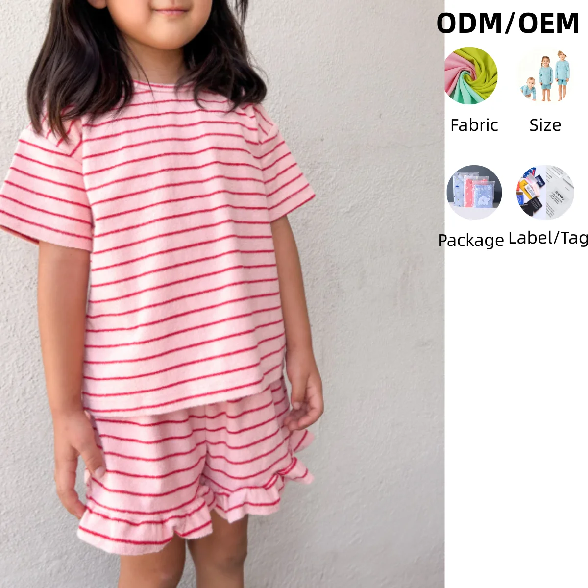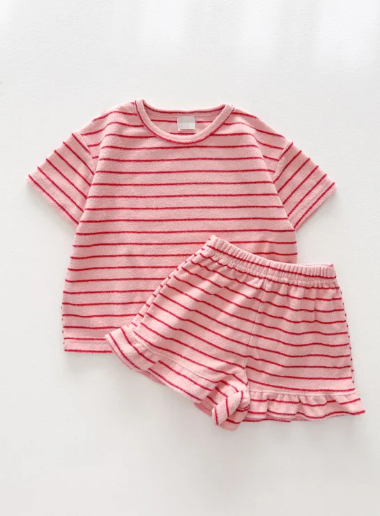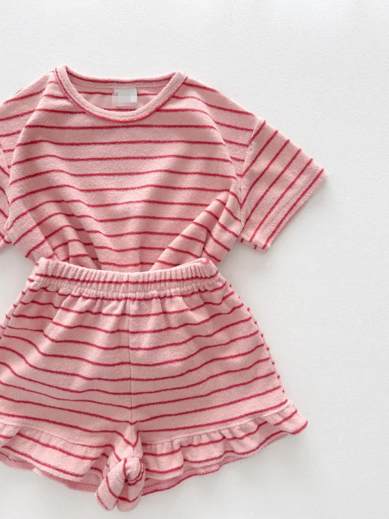 Kids Terry Cloth Stripe Short Sleeve Top and Ruffle Hem Shorts Set Breathable Girl Beach Wear Baby Clothing Set