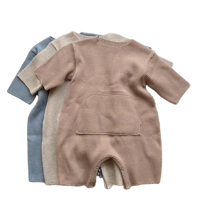 New Arrival Waffle Cotton Solid Color Long Sleeve Unisex Baby Bubble Romper for Autumn