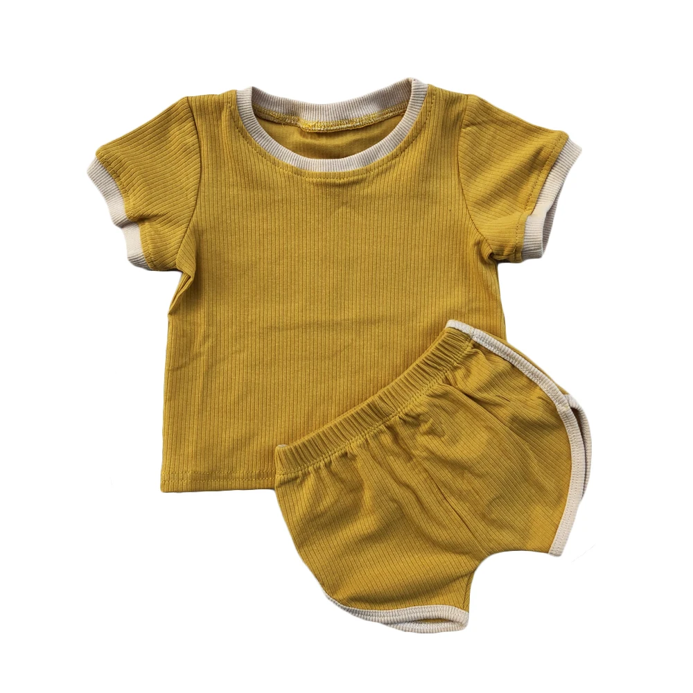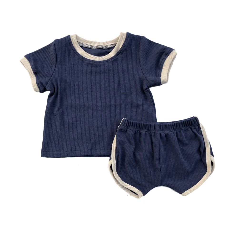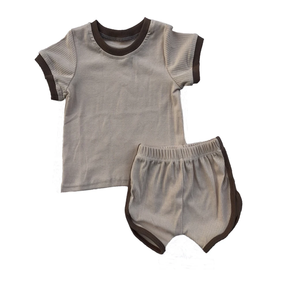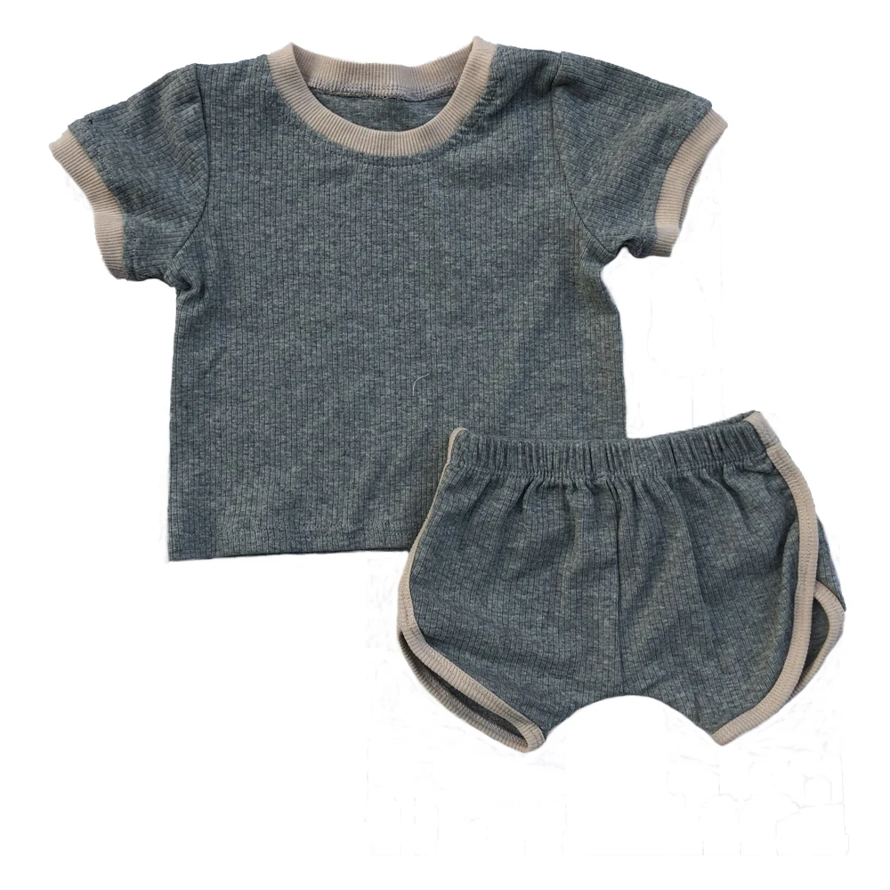 New Design Summer Baby Boy Sets Splice Blank Rib Cotton Short Sleeve T-shirts and Opening Legging Shorts Kids Outfits