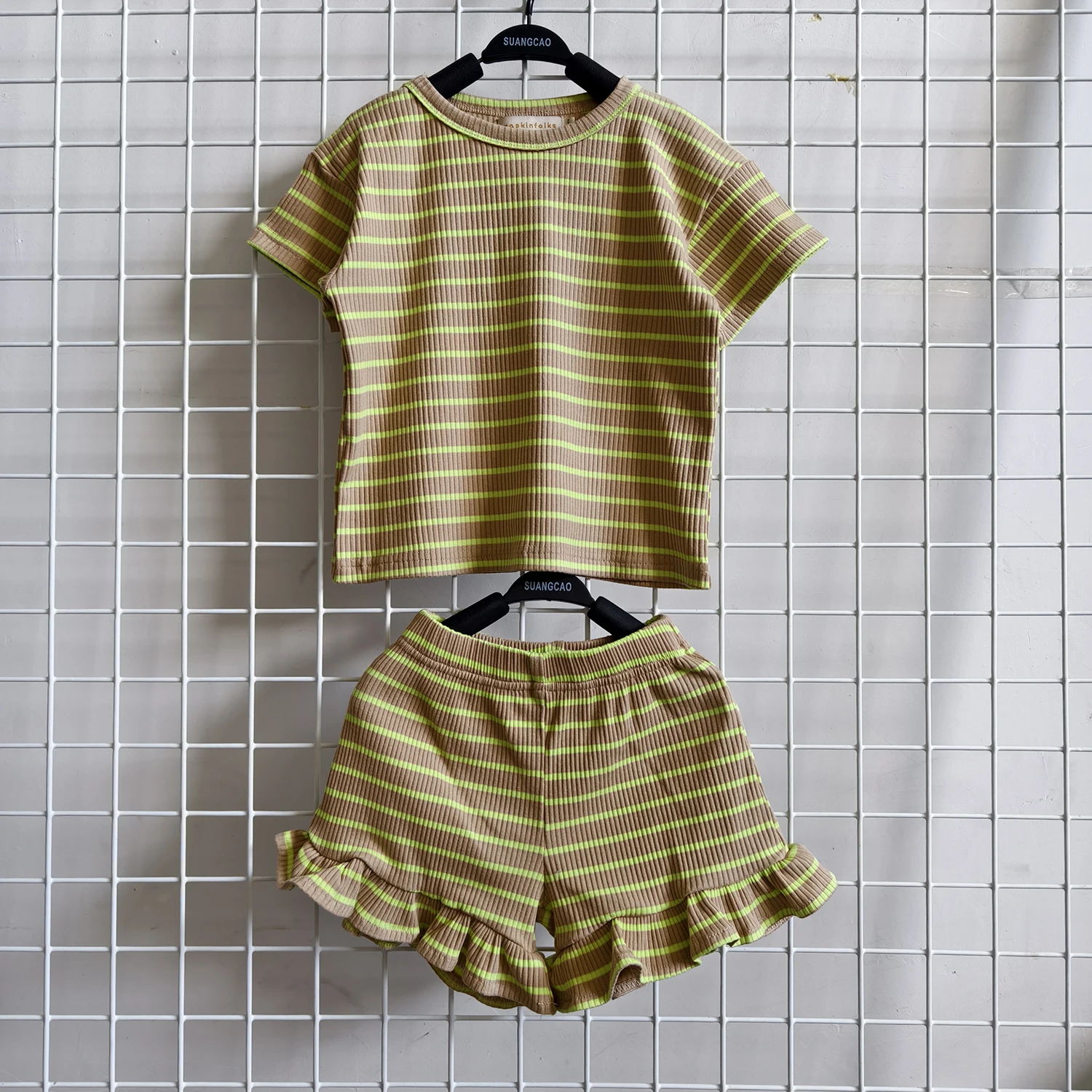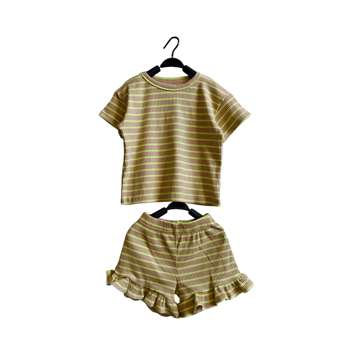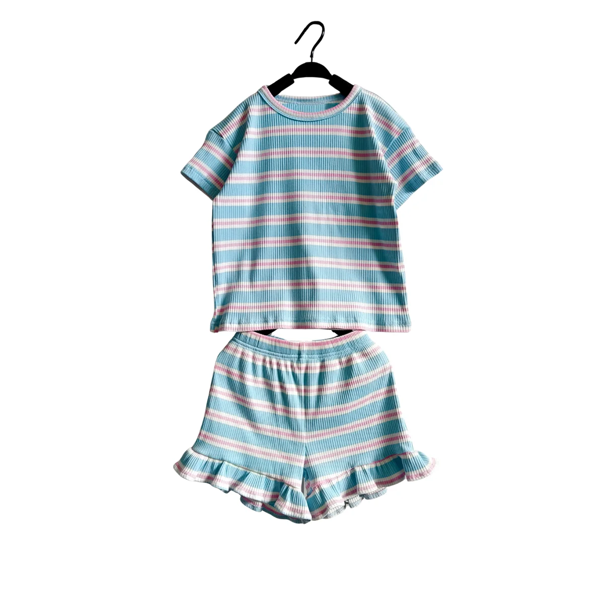 OEM Kids Clothes Set Toddler Baby Girl Summer Clothes Ruffle Ribbed Knit Short Sleeves T-Shirt Tops + Shorts Cute Outfits Set