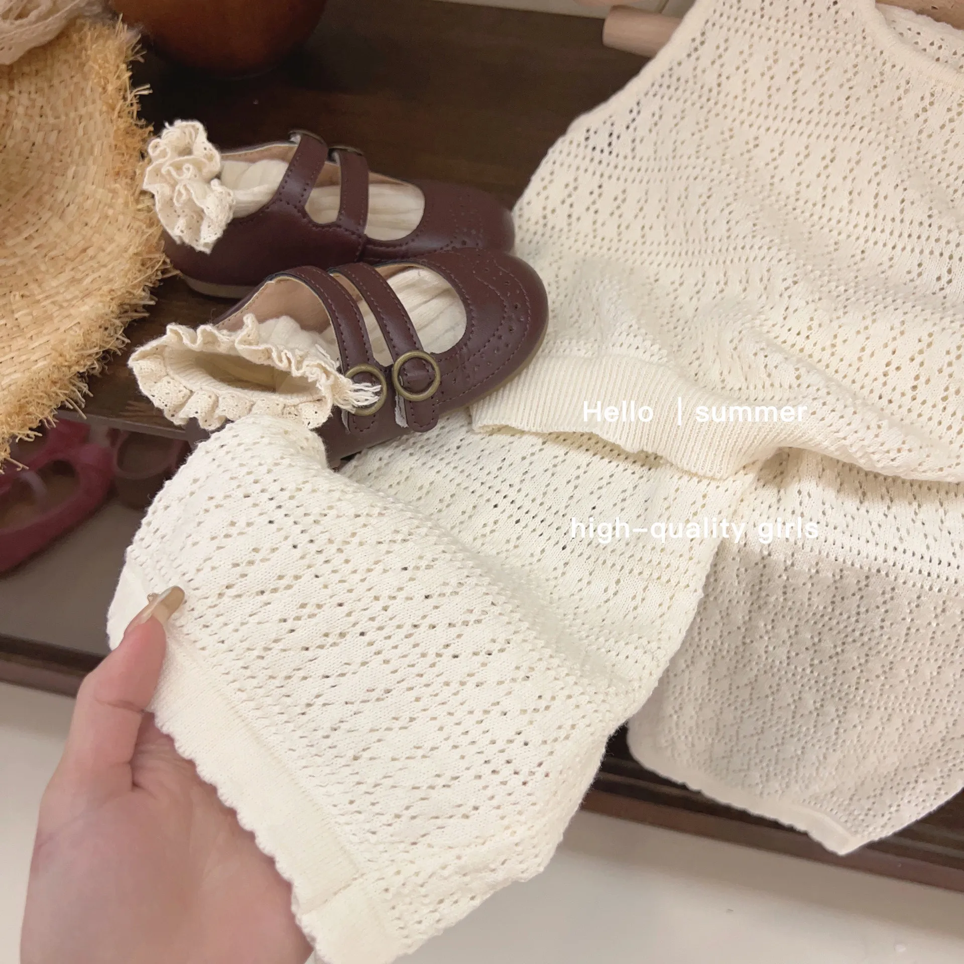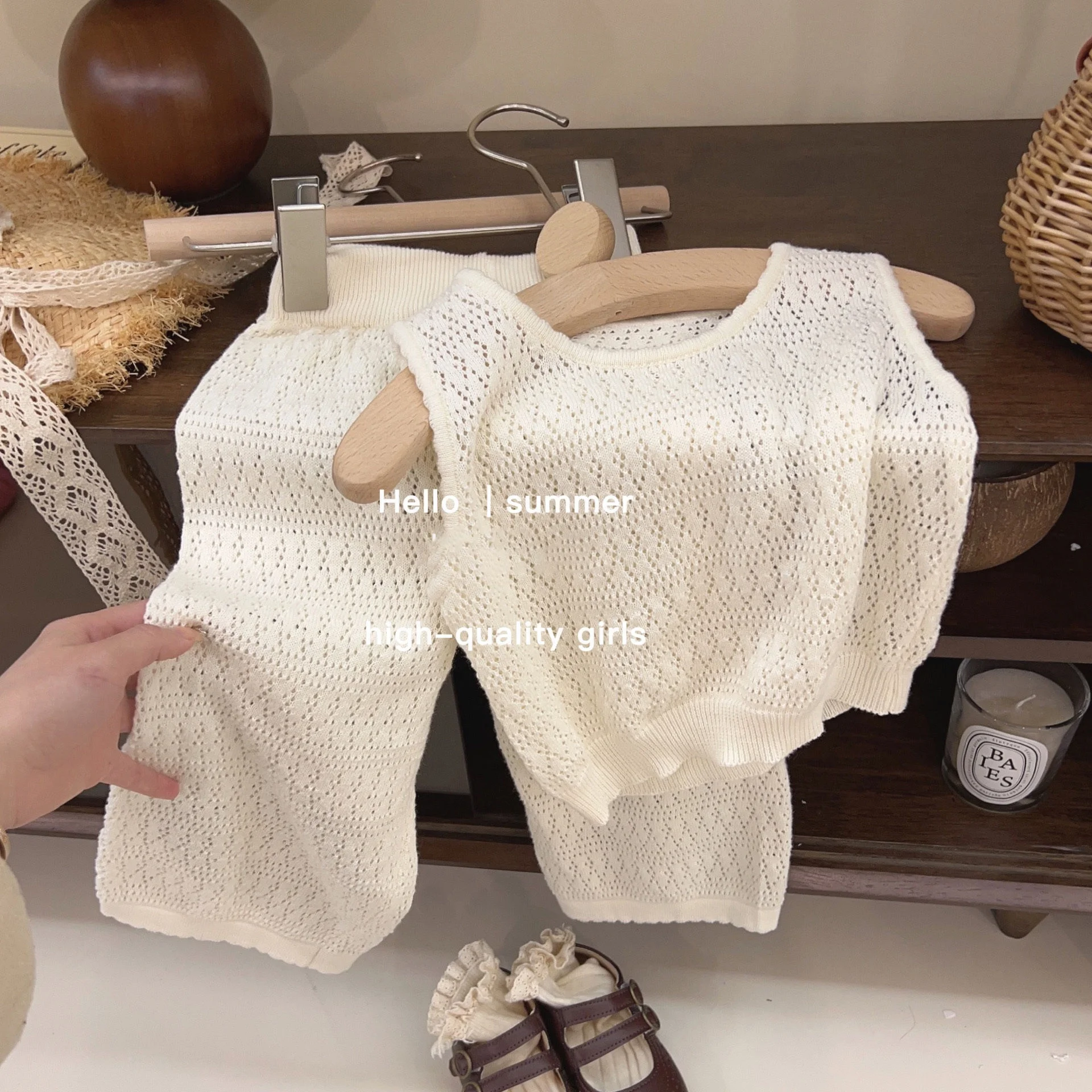 RTS Hot Sell Beige Soft Baby Girl Summer Knitted Hollow Vest Wide Leg Pants Two Piece Clothes Set
