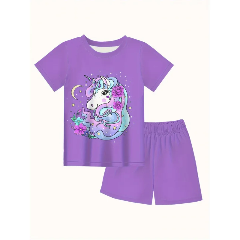 Soft Baby Summer Set Clothing Set Girls Silk Unicorn Print Pajama Set Short Sleeve Top & Elastic Waist Shorts Kids Loungewear