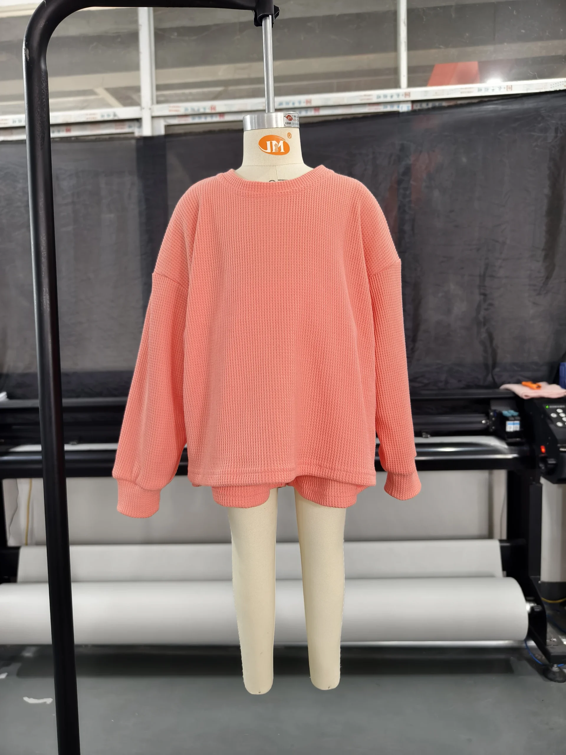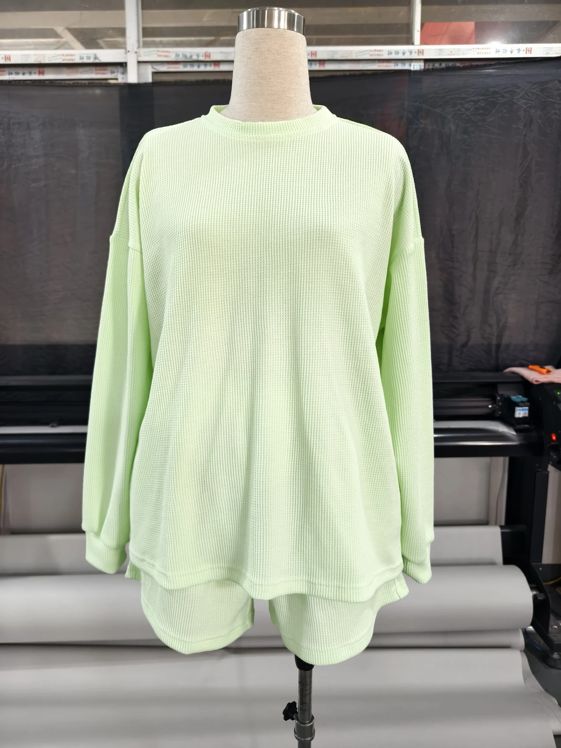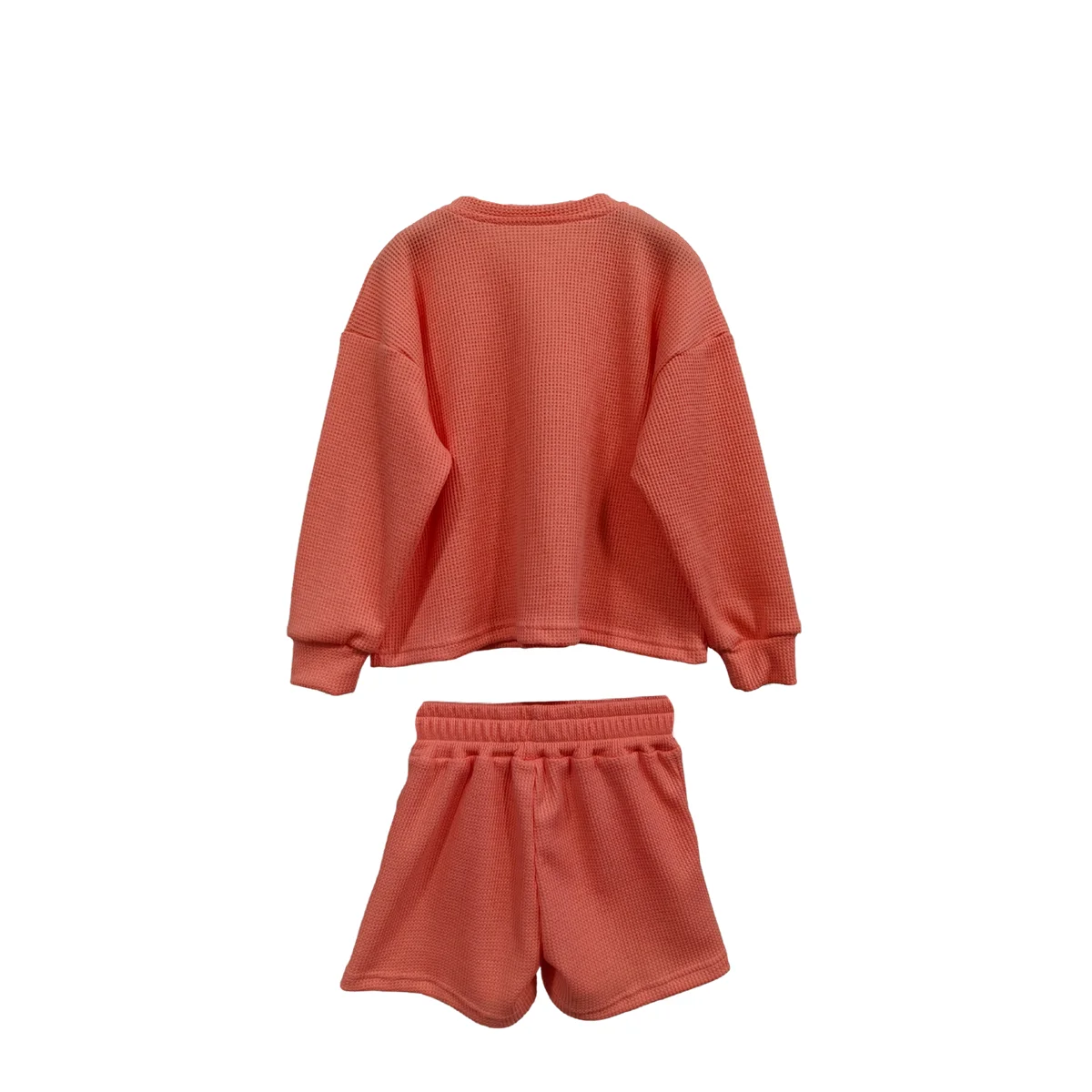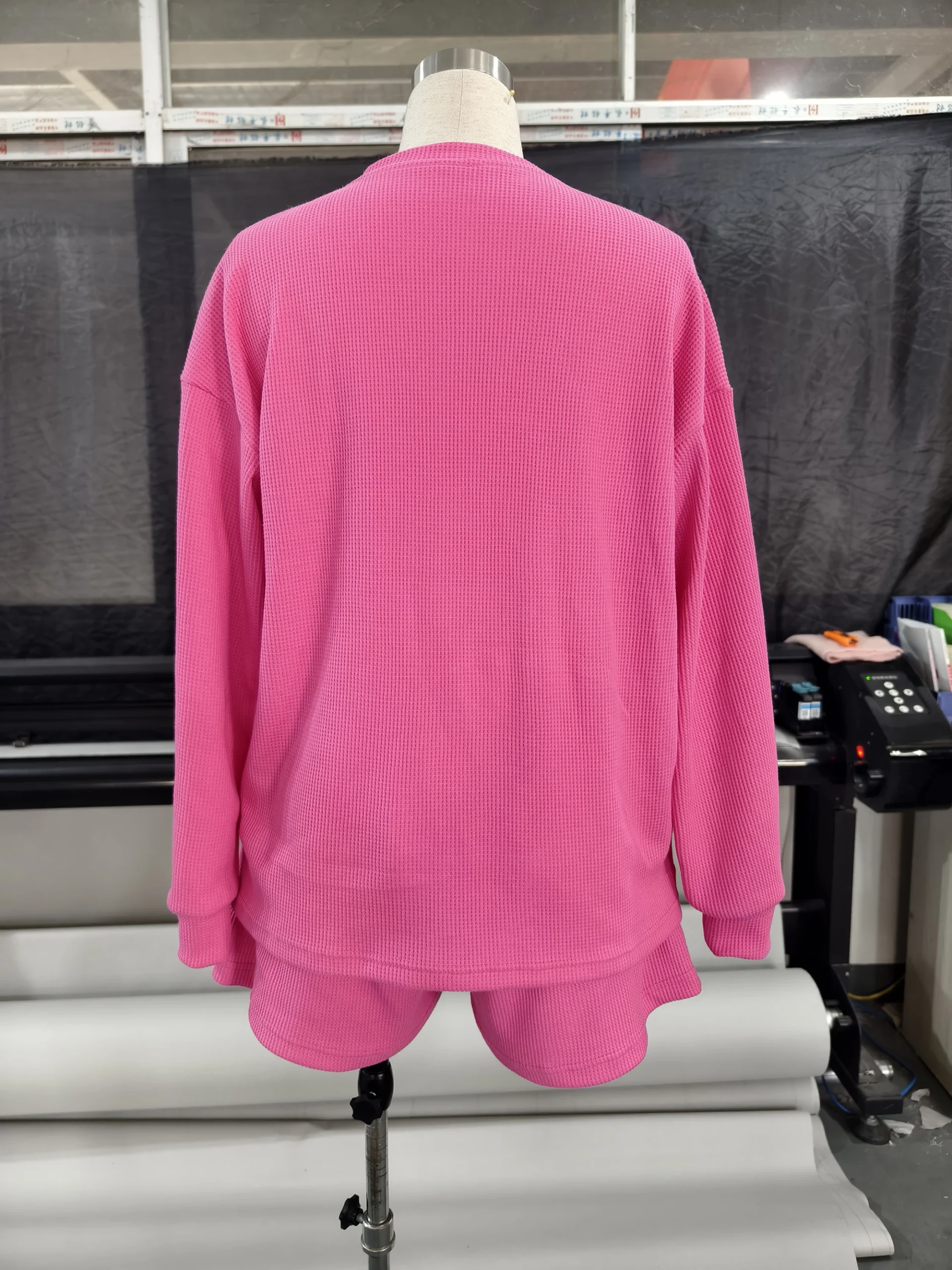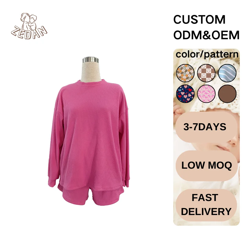 Spring Cozy Days Mommy and Me Waffle Set Solid Color Long Sleeve T-shirt and Short 2pcs Casual Outdoor Set