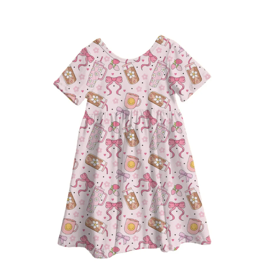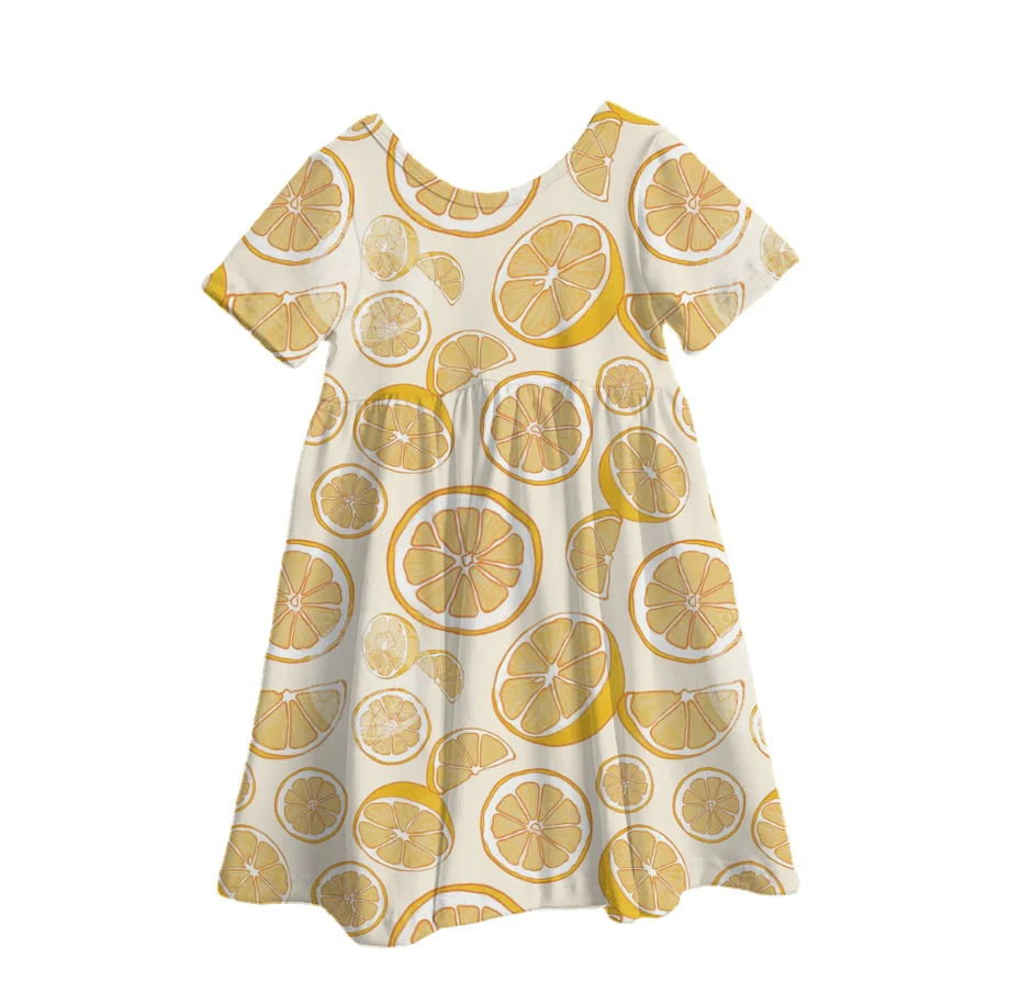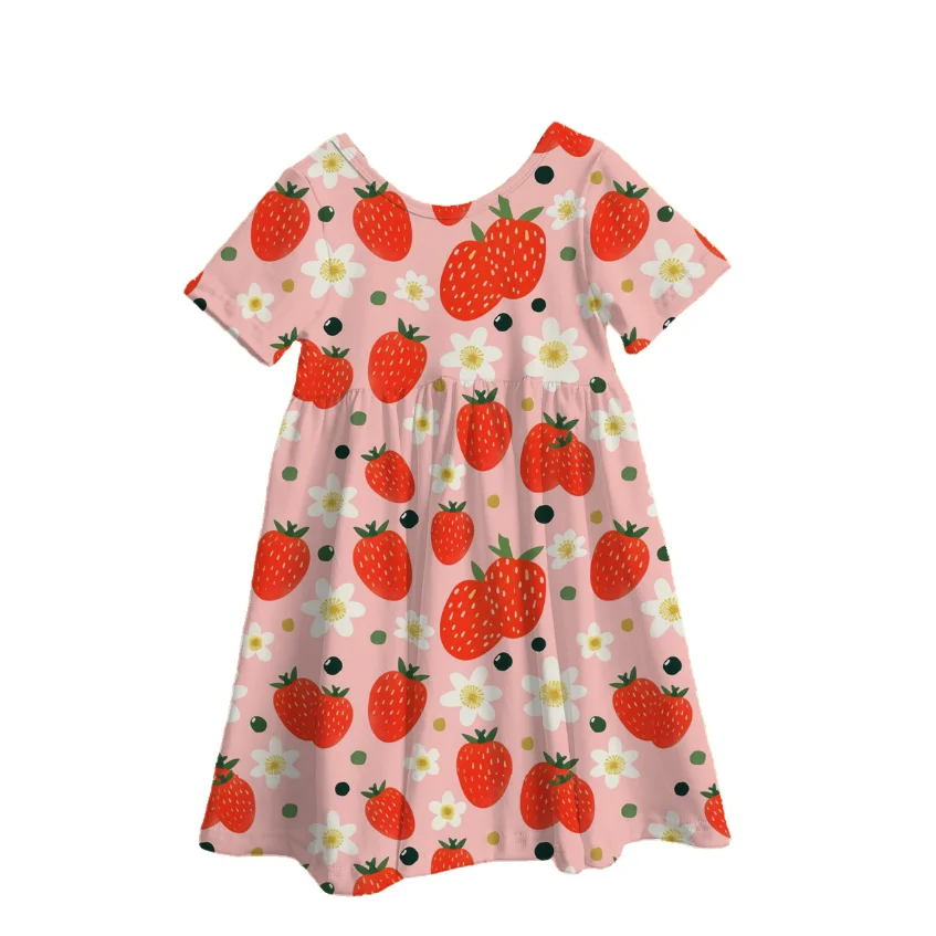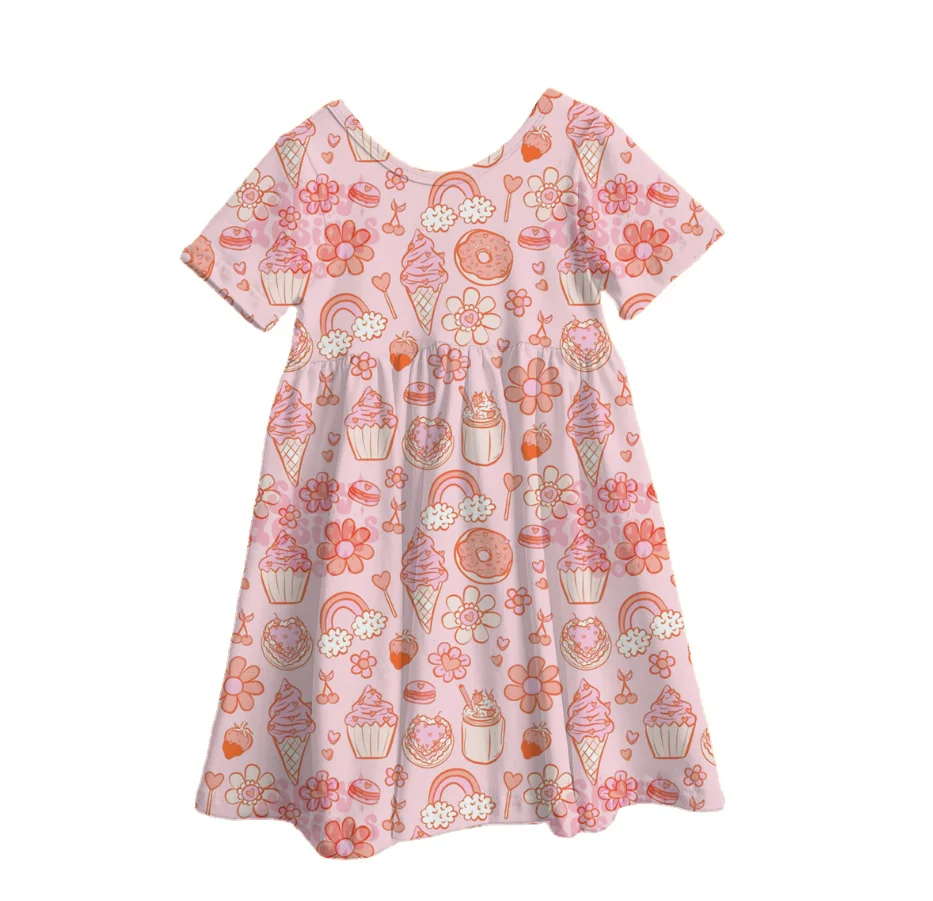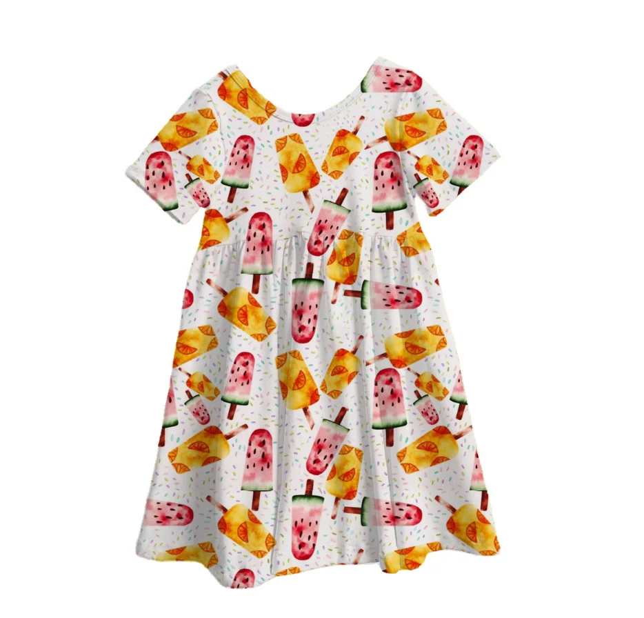 Summer Fruit Ice Cream Bamboo Print Baby Girls Dress Back to School Pattern Casual Short Sleeve Kids Dresses