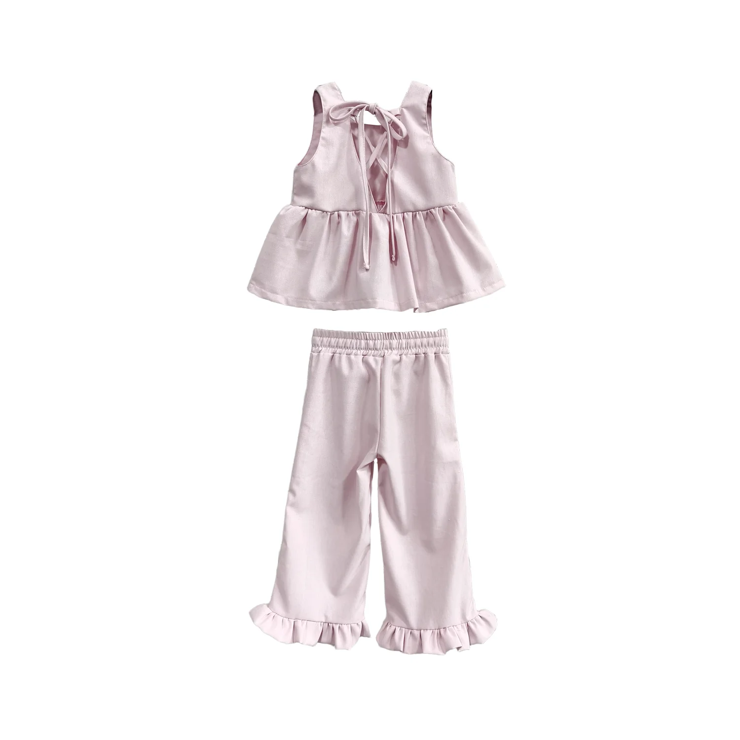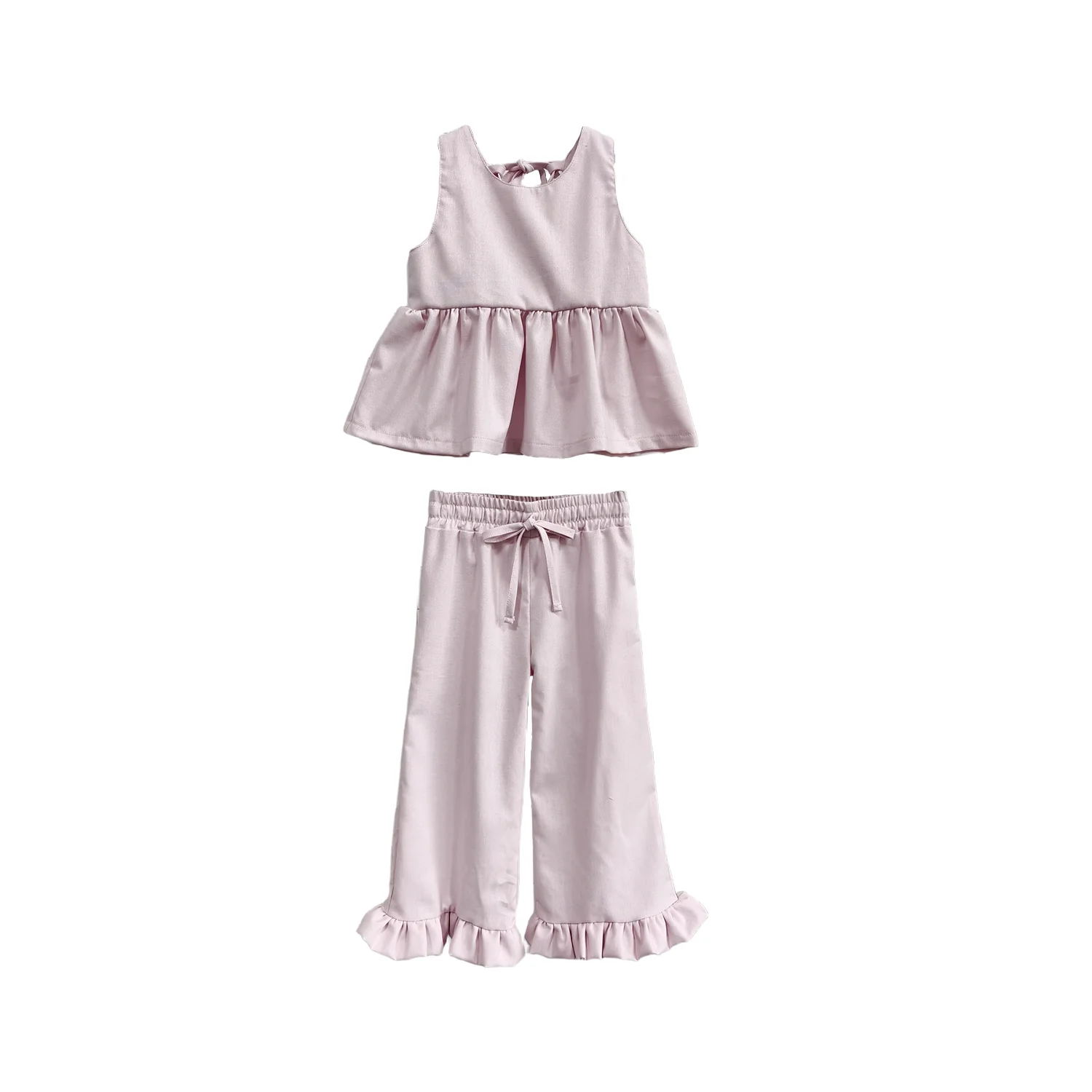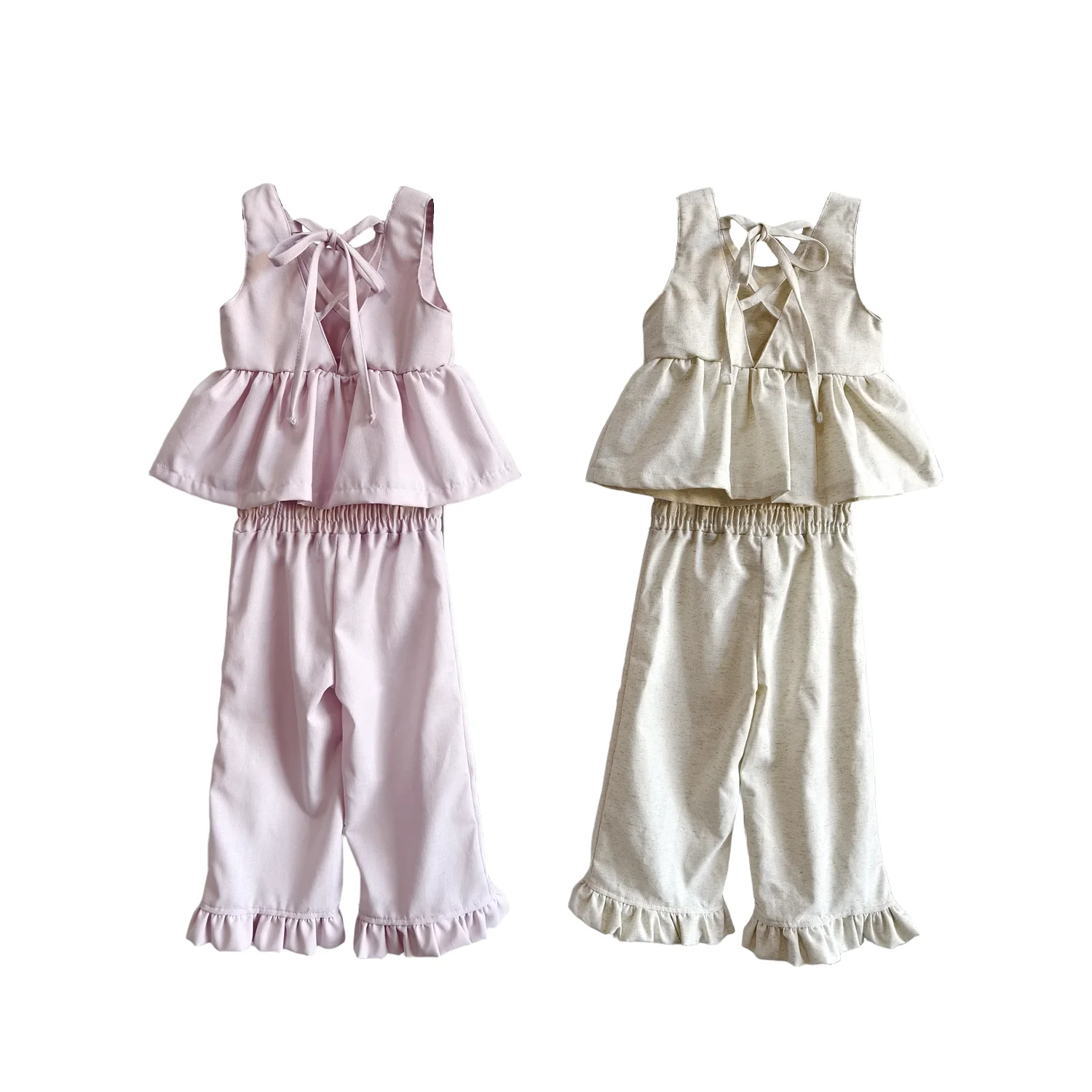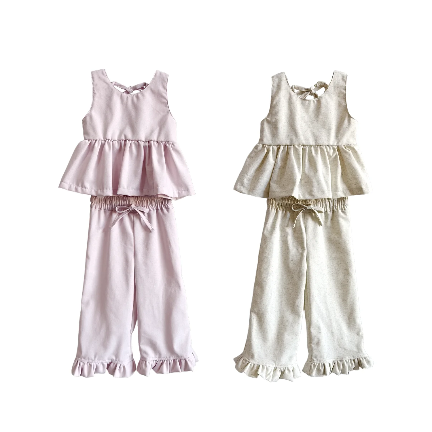 Summer Girl’s Outfit Organic Crinkle Gauze Girls Set Tie Shoulder Smocked Peplum Top & Wide Leg Pants Summer Outfit 0-10T