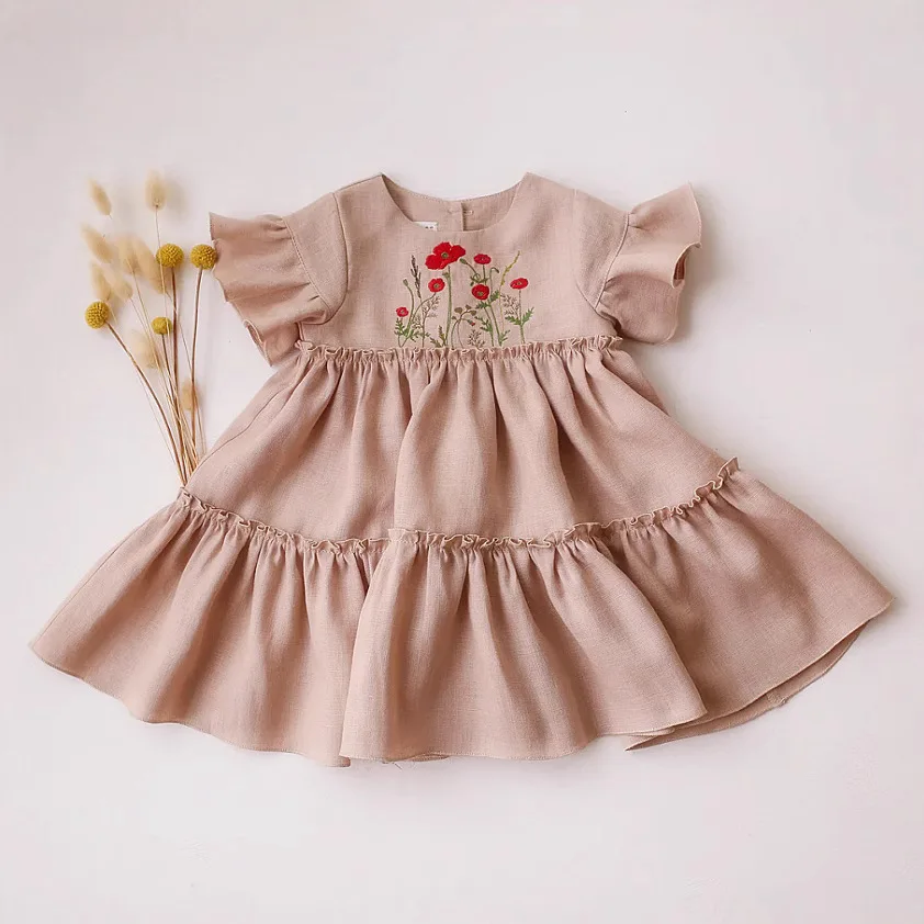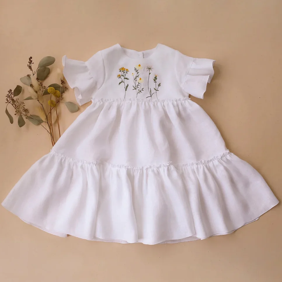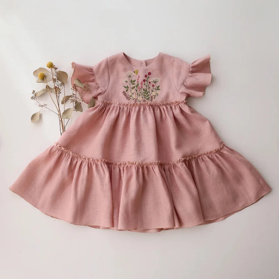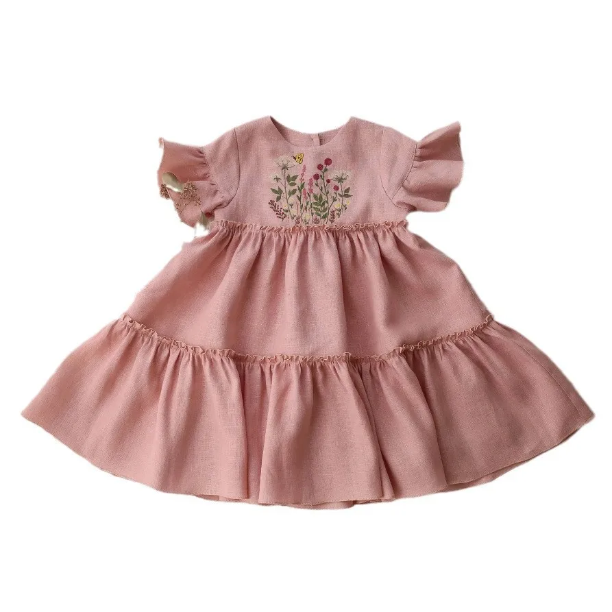 The Latest Summer Girls Princess Dress Cake Skirt Pleated Trumpet Sleeve Cotton and Linen Embroidery Vest Skirt